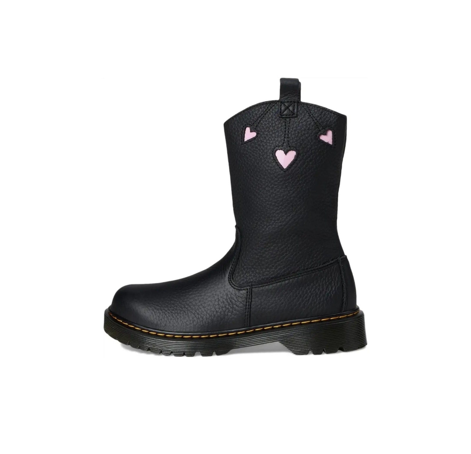 Elevate your little one's style choosing the Dr. Martens® Kid's Collection Bex Heart P-O Boots Youth. These comfy boots are constructed with soft and supple Nappa leather upper, providing comfort and durability for all-day play. The EVA insole offers cushioned support, while the triple heart cut-out design and heart-shaped zipper pull add a touch of fun. With contrast lining and a flexible, lightweight cemented construction, these boots are perfect for growing feet.