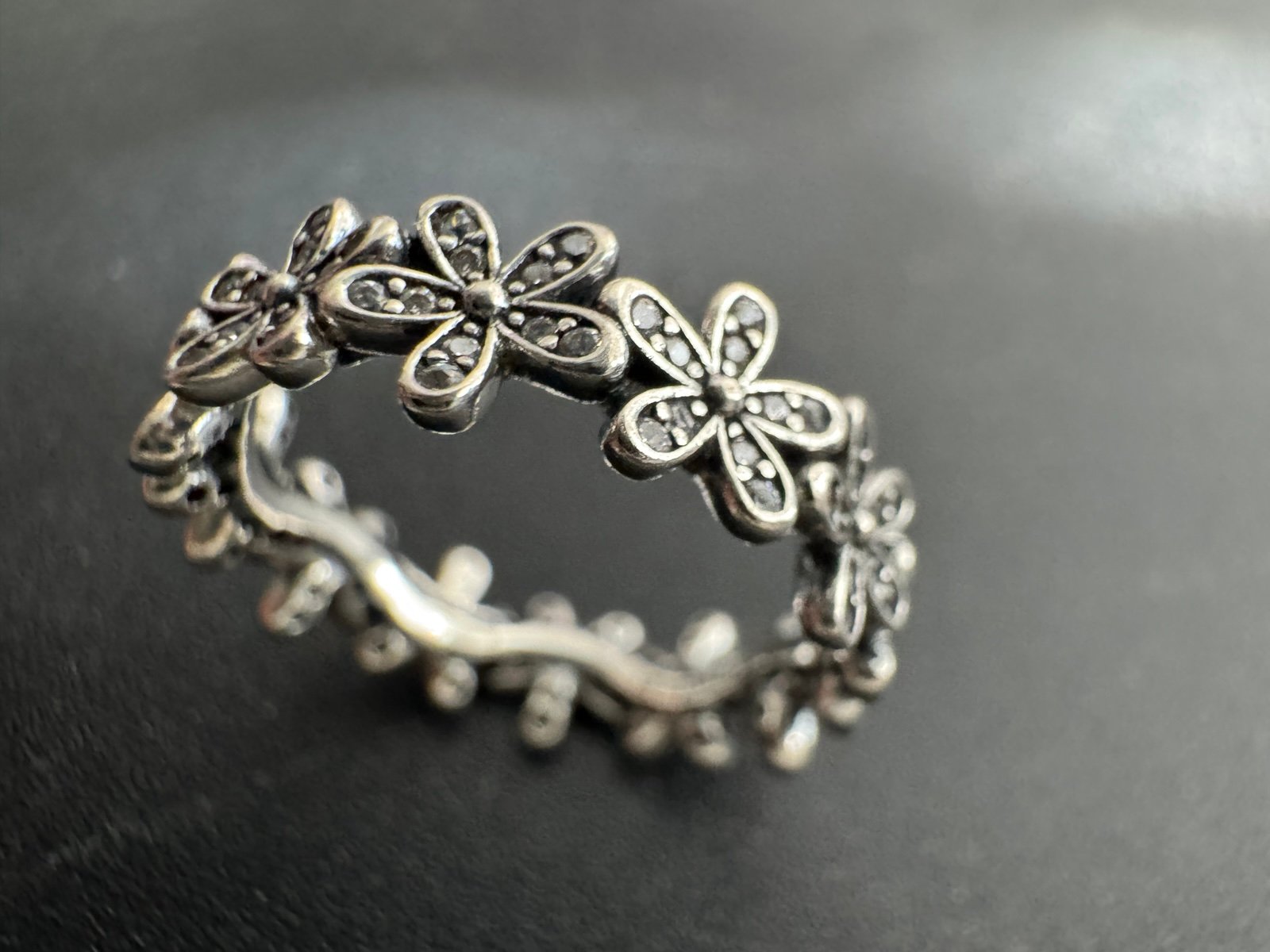 Pandora daisy flower sterling silver ring with cubic zirconia stones. Size 6. Excellent condition. Flowers wrap around the entire Ring, retail price is $105. I have a lot of other Pandora items listed on my site, including Disney X Pandora charms and bracelets. You can bundle and save even more! Thanks.